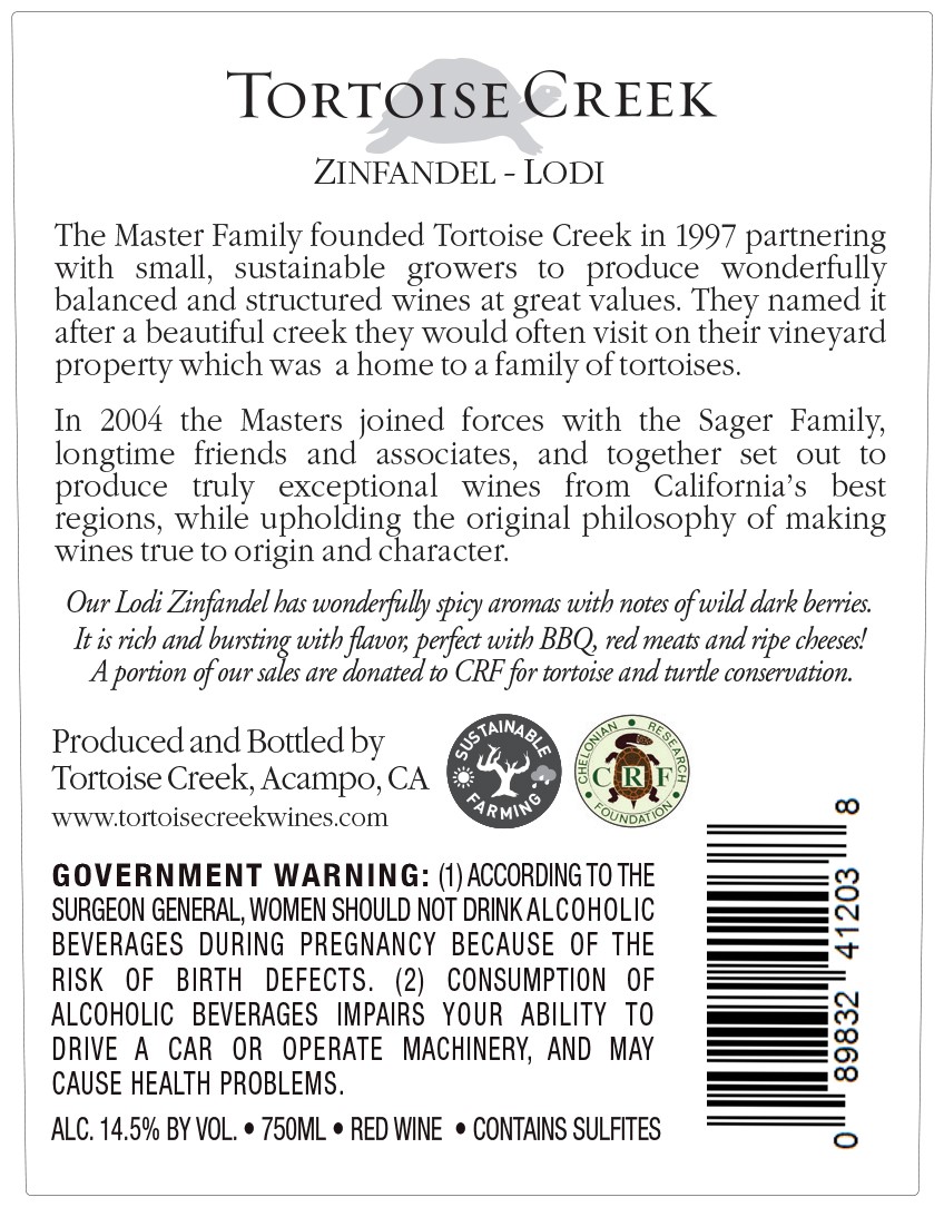 The concept with Tortoise Creek is to work with small farmers in California who focus on sustainable farming. Tortoise Creek is handcrafted, small-batch wines selected and blended from growers who understand this philosophy.