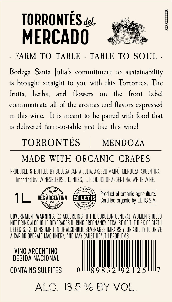 Santa Julia Torrontés del Mercado reflects our daily respect for and commitment to nature. This wine is meant to be enjoyed at your dining table with the freshest food. The fruit, herbs, and flowers on the front label communicate all of the aromas and flavors expressed in this wine. The wine is both fresh and modern, produced with little intervention, just as your food is from the farm to the table.