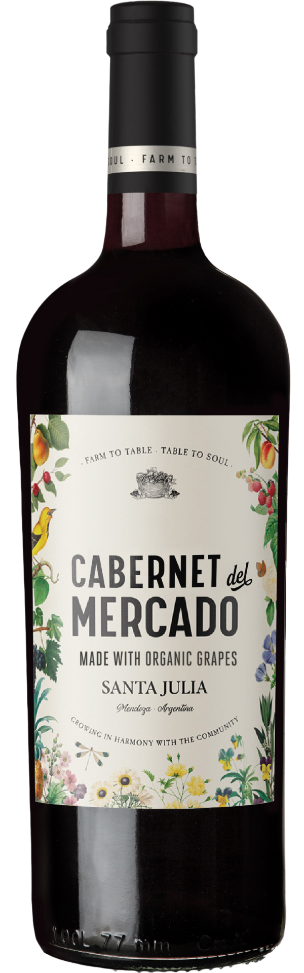 Santa Julia Cabernet del Mercado reflects our daily respect for and commitment to nature. his wine is meant to be enjoyed at your dining table with the freshest food. The fruit, herbs, and flowers on the front label communicate all of the aromas and flavors expressed in this wine. The wine is both fresh and modern, produced with little intervention, just as your food is from the farm to the table.
