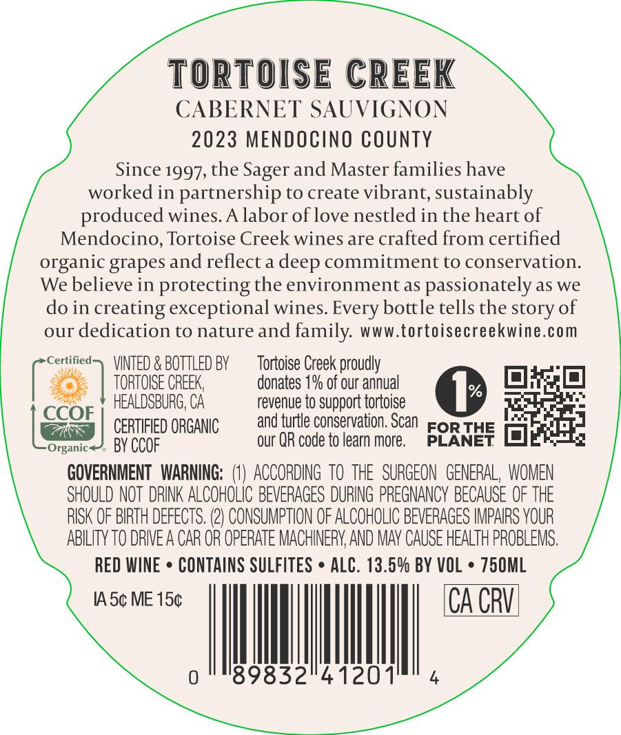 The Tortoise Creek Cabernet Sauvignon is sourced from Certified Organic & sustainably farmed vineyards in Mendocino County.